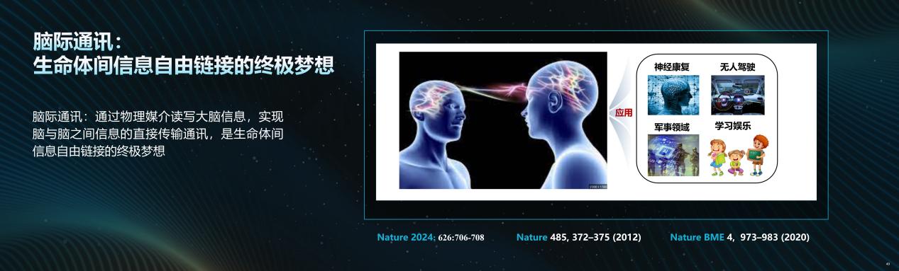 迈向《阿凡达》时代:脑机接口的终极形态是“链接” 理解大脑是人工智能发展的必然路径。当前基于硅基计算的人工智能虽然在数据处理上表现出色,但其“智能”缺乏情感与真正的理解能力。相比之下,人类大脑拥有860亿神经元,构成了极为复杂的神经活动、情感活动、智力活动。电影《阿凡达》中通过神经接口实现“心神合一”的设想,预示了这一领域的核心方向:本质是大脑与大脑之间的交互,而不仅是大脑与计算机的简单连接,为超越传统“脑机接口”概念的脑际通讯提供了宏大图景。事实上,我们早已身处脑机接口的初级形态——手机屏幕作为触觉接口,眼睛作为视觉接口,耳朵作为听觉接口,都在持续将外部信息输入并存储于我们的大脑。 当前主流的脑机接口技术,多通过侵入或半侵入式电极阵列“读取”大脑神经信号,实现对外部设备的控制,或“写入”信息以进行感官修复。马斯克的Neuralink等企业正致力于此,已在残疾人运动功能重建等领域取得突破。但无论是钻孔植入的侵入式,还是较浅的半侵入式,核心局限都在于依赖物理电极,且功能多为单向。真正的突破在于实现双向、无损的“读写”机制——既能精准解读大脑的思维活动,又能将外部信息无损地“写入”大脑。构建脑与机器之间真正的“对话”,而非单方面的指令传输。因此,脑机接口的终极形态,应是实现脑际通讯。通过物理媒介读写大脑信息,实现大脑间、脑机间直接高效的信息与智能交换。