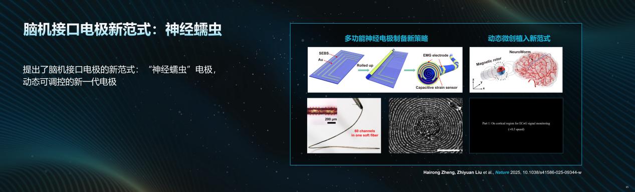 为实现从观察大脑静态结构到解码调控动态功能的目标,我们课题组聚焦超声技术的微观应用;研究 λ/n尺度的生物效应,开展超分辨成像、细观器官打印、细胞操控、离子通道的调控等研究。当科学工具触及极微观领域,我们发现了全新的物理效应,这些效应可成为生物智能研究的重要工具。通过对微血流等信号的监测,我们能"看到"并尝试翻译大脑的意图状态,例如识别实验动物是想进食还是想喝水。 在此基础上,我们发展了全脑皮层的神经影像技术,提出颠覆性的"神经打印机"概念,核心是利用声、光、磁等物理场无创地调控大脑中的纳米级离子通道,实现将外部信息"写入"大脑。这不仅是治疗癫痫、抑郁症等脑疾病的变革性手段,更可能重塑人类获取知识的方式。 为了更精确地"读取"神经信号,我们开发了"蠕虫电极"等新型柔性侵入式接口,它能以极小损伤实现脑内长期稳定的信号记录。未来的脑机接口必将与信息技术、生物技术深度融合,借助大模型对海量神经信号进行精准解码。