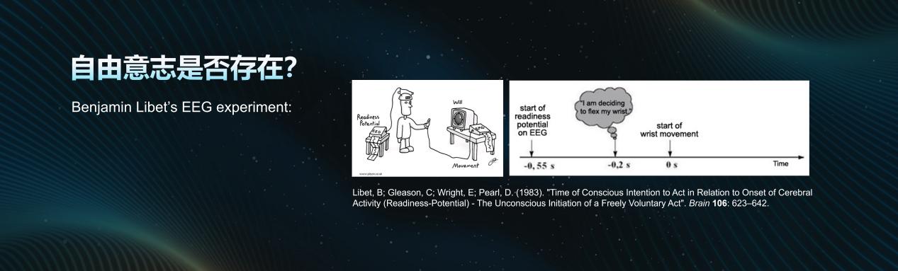 在探讨意识时,“自我意识”是一个核心议题。经典的镜像识别常被拿来作为研究工具,但能否识别镜像并不完全等同于自我意识的存在。可能只是受制于认知禀赋或测试情境。我国神经科学家的研究发现,猕猴可通过训练的方式学会识别镜像中的自己。这表明某些自我意识的基盘或许可以通过后天经验被激活和塑造。 关于自我意识的本质,苏格兰哲学家休谟认为,自我意识本质上是各种知觉意识的“捆绑”。而“裂脑人”与“半脑睡眠”的动物研究则表示,意识可能并非铁板一块,大脑的不同半球或许能支持相对独立的意识控制、意识体验。 那我们人到底有没有自由意志?这个是一个很大的课题。加州大学教授 本杰明·利贝特的经典脑电实验发现,在个体主观意识到“决定”之前,大脑中已出现预示着该动作的电信号。这引发了“自由意志是否只是一种错觉”的激烈争论。