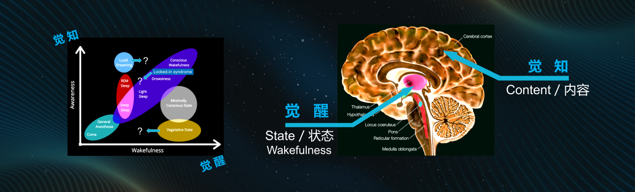 试想,如果在痛苦的监狱生活与“舒适”的植物人状态之间进行选择,几乎没有人会选择后者。这表明,意识的存在赋予了人类生命意义。不仅如此,理解意识对于理解知觉、注意、记忆、决策等各种认知功能都至关重要,它是贯穿认知科学领域的一条主线。 从理解意识到底代表什么含义的角度,我们就可以把对意识的描述分成两个维度,横坐标代表意识的水平,即从昏迷、麻醉到清醒的觉醒程度。纵坐标代表意识的内容,即个体对特定信息是否“觉知”。临床上会关注植物人、昏迷患者的意识水平恢复,而在认知实验中,则会更多地去探究为何有些进入大脑的信息未被“意识”到,却仍能影响行为。