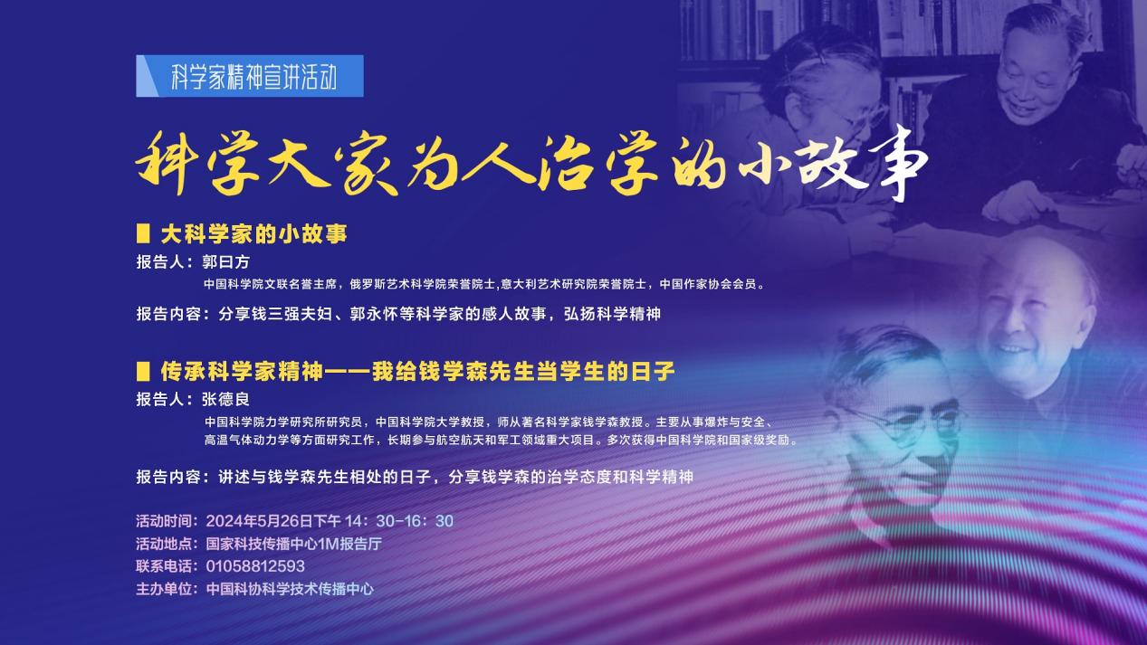 活动类型:线下活动 活动介绍:为弘扬科学精神,传承科学家们的爱国情怀、创新精神和求真务实的态度,我们特别策划了“科学大家为人治学的小故事”科学家精神宣讲活动。本次活动将通过讲述钱三强夫妇、郭永怀、汤佩松、王竹溪等科学元勋的感人故事,展现他们为人治学的风采,激励更多人投身于科学研究事业。 活动内容: 1.大科学家的小故事 报告人:郭曰方(中国科学院文联名誉主席,俄罗斯艺术科学院荣誉院士,意大利艺术研究院荣誉院士,中国作家协会会员。) 报告内容:分享钱三强夫妇、郭永怀等科学家的感人故事,弘扬科学精神。 2.传承科学家精神——我给钱学森先生当学生的日子 报告人:张德良(中国科学院力学研究所研究员,中国科学院大学教授,师从著名科学家钱学森教授。主要从事爆炸与安全、高温气体动力学等方面研究工作,长期参与航空航天和军工领域重大项目。多次获得中国科学院和国家级奖励。) 报告内容:讲述与钱学森先生相处的日子,分享钱学森的治学态度和科学精神。 活动时间:2024年5月26日下午 14:30-16:30 活动地点:国家科技传播中心1M报告厅 报名地址:(转链网络中心活动报名地址:https://huodong.kepu.net.cn/#/activity/detial?id=3568 中国科普博览·活动-科学大家为人治学的小故事 (kepu.net.cn)) 联系电话:01058812593 主办单位:中国科协科学技术传播中心 承办单位:中国科学院计算机网络信息中心 中国科学院科技创新发展中心 活动宣传图: